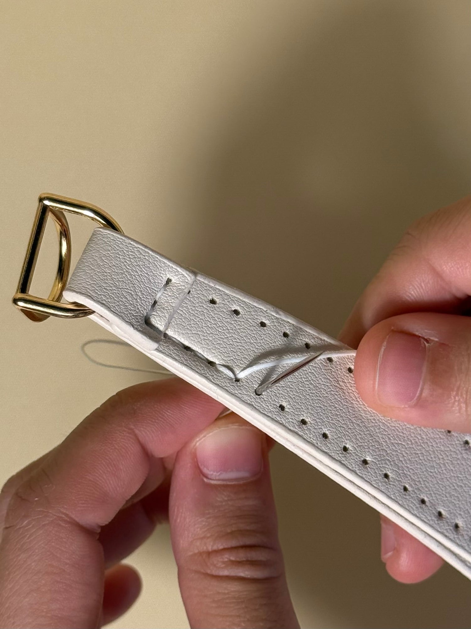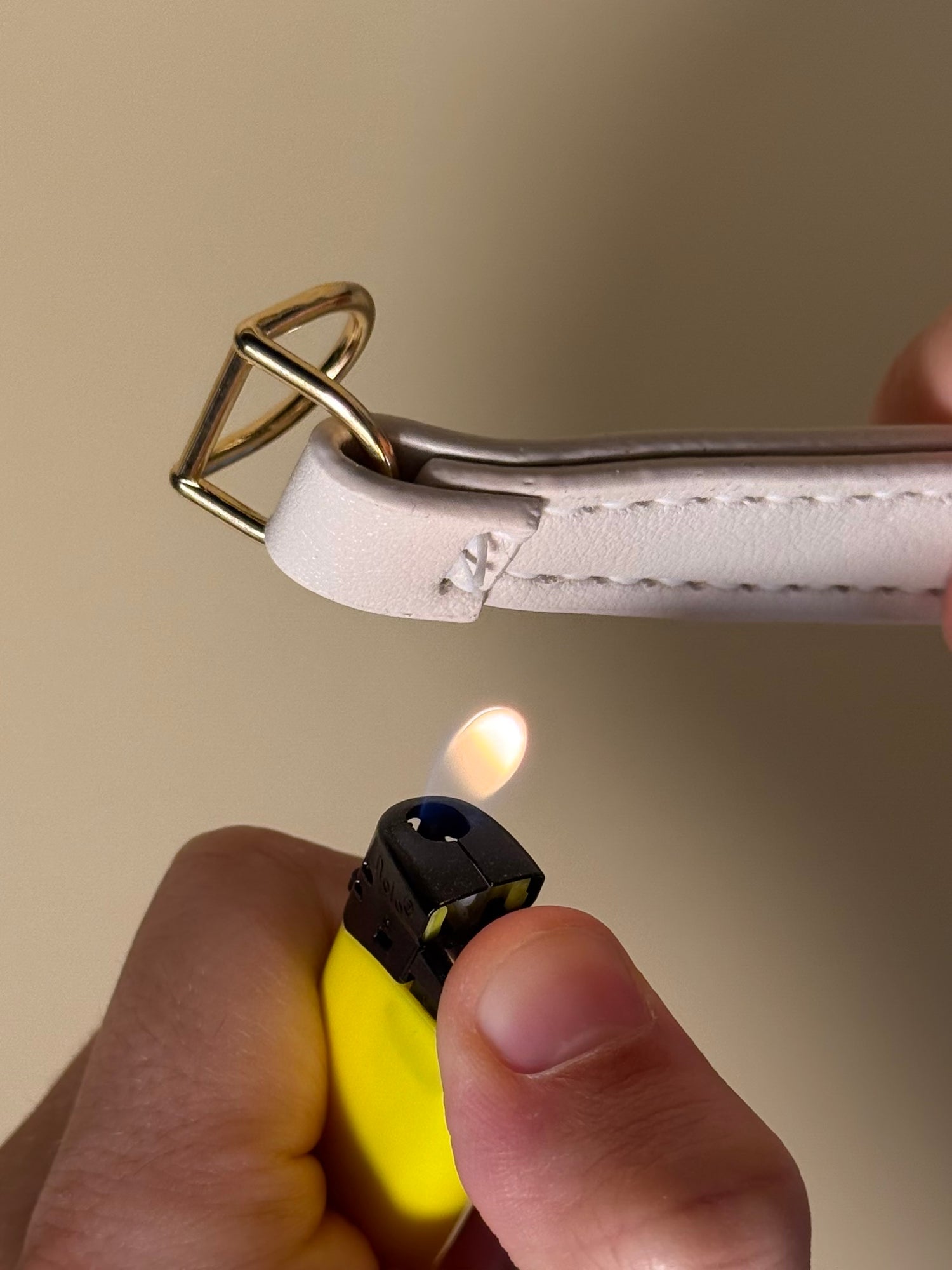 Si ripassa un paio di volte sul punto appena cucito, si portano i fili dallo stesso lato e si taglia l’eccedenza. Un tocco di accendino fa sparire il filo e crea un nodo invisibile ma super resistente.